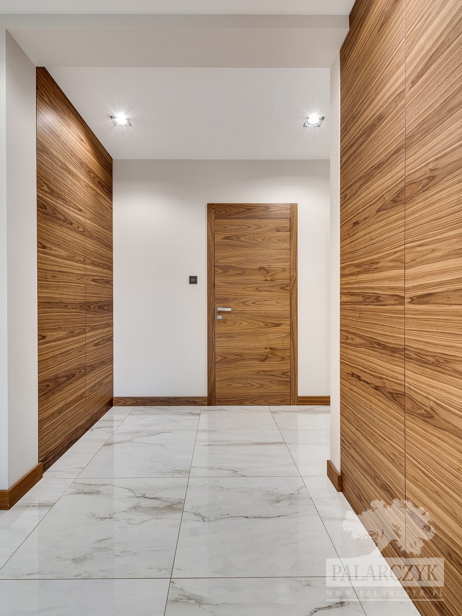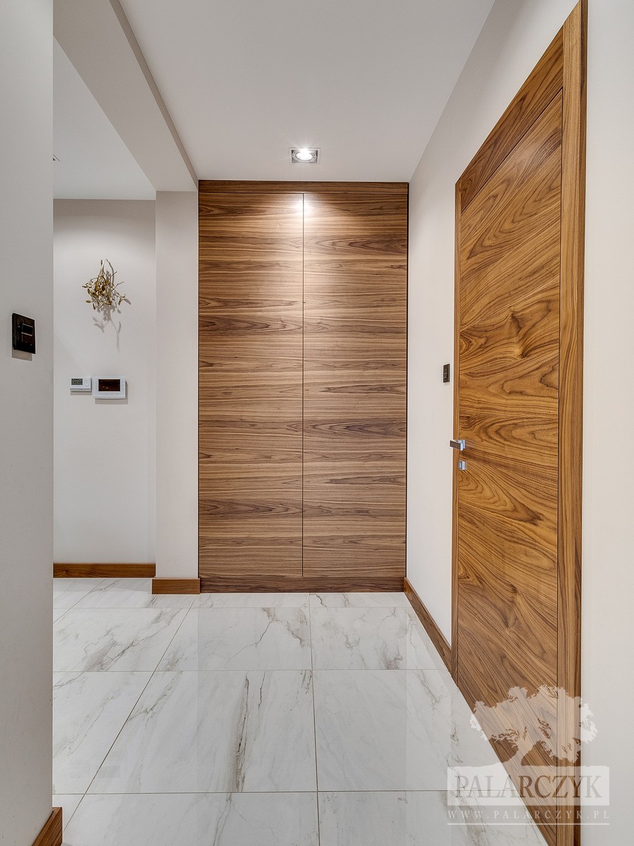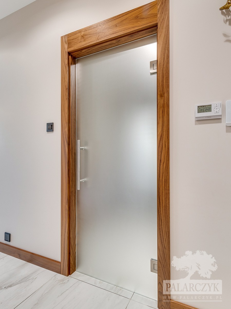 Zapraszamy do zapoznania się z naszą poniższą realizacją – drzwiami wewnętrznymi i zabudową wnękową, które zachwycają swoim wykończeniem w orzechu amerykańskim. Takie wykorzystanie forniru sprawia, że zarówno drzwi, jak i szafa, prezentują się niezwykle spójnie, tworząc elegancki i ciepły klimat wnętrza. W zestawieniu z bogatym wzorem marmurowej podłogi, drewno orzechowe jeszcze bardziej zyskuje na głębi koloru. Dodatkowo, w ramach tej realizacji, zaimplementowaliśmy nowoczesne rozwiązanie w postaci pełnego skrzydła szklanego na zawiasach wahadłowych wyposażonych w cichy domyk, zapewniając tym samym komfort użytkowania na najwyższym poziomie. Zapewniamy, że każdy detal naszych produktów został dopracowany z największą precyzją, aby sprostać oczekiwaniom naszych Klientów.