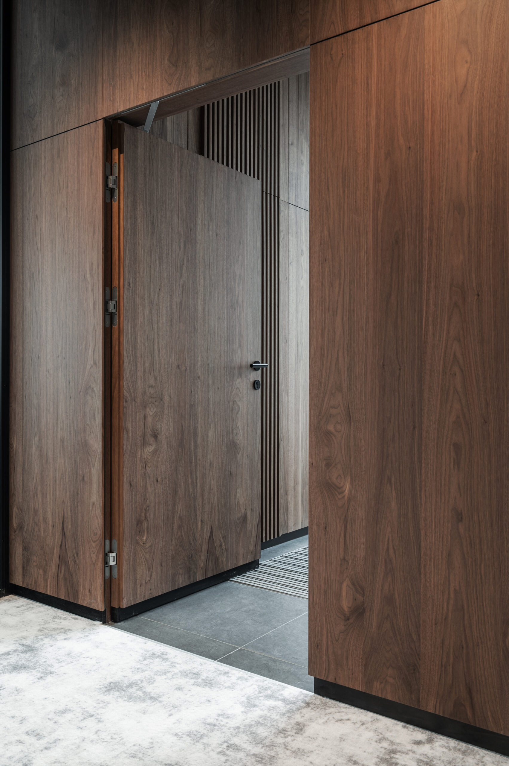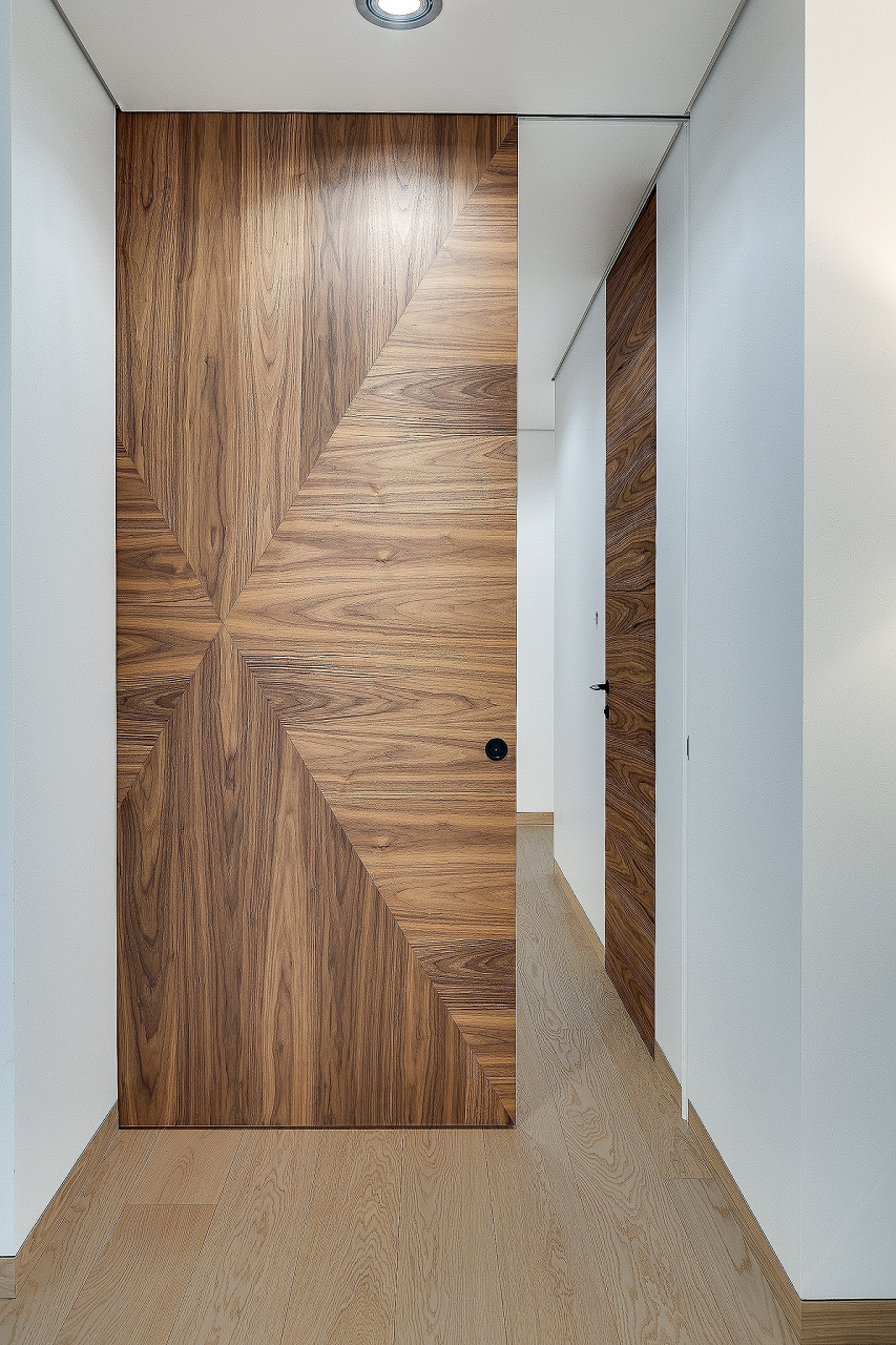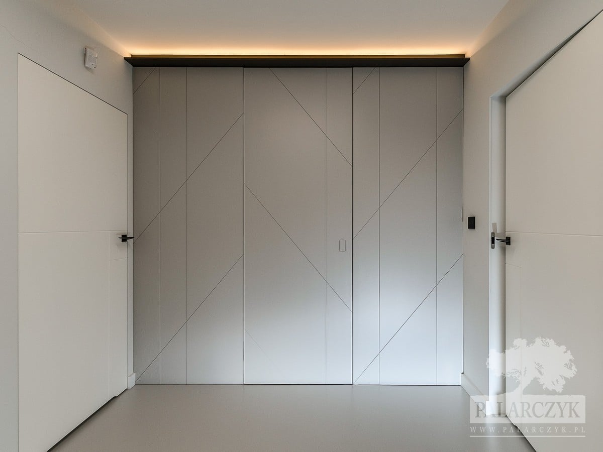 Prezentujemy ekskluzywną realizację, która łączy funkcjonalność z nowoczesnym designem. Na zdjęciu widać drzwi wewnętrzne z ukrytą ościeżnicą, które w perfekcyjny sposób wpisują się w zabudowę garderoby. Co więcej, garderoba ozdobiona jest elementami boazerii, w której dyskretnie ukryte są drzwi. To połączenie daje efekt niezwykle spójnej i estetycznie dopracowanej przestrzeni. W drzwiach zastosowano innowacyjny zamek magnetyczny Bonaiti NO-HA, cechujący się brakiem wystających elementów poza płaszczyznę skrzydła, co pozwala na utrzymanie minimalistycznego i czystego wyglądu. To rozwiązanie, które zadowoli najbardziej wymagających klientów poszukujących unikatowych i funkcjonalnych rozwiązań w swoim wnętrzu.