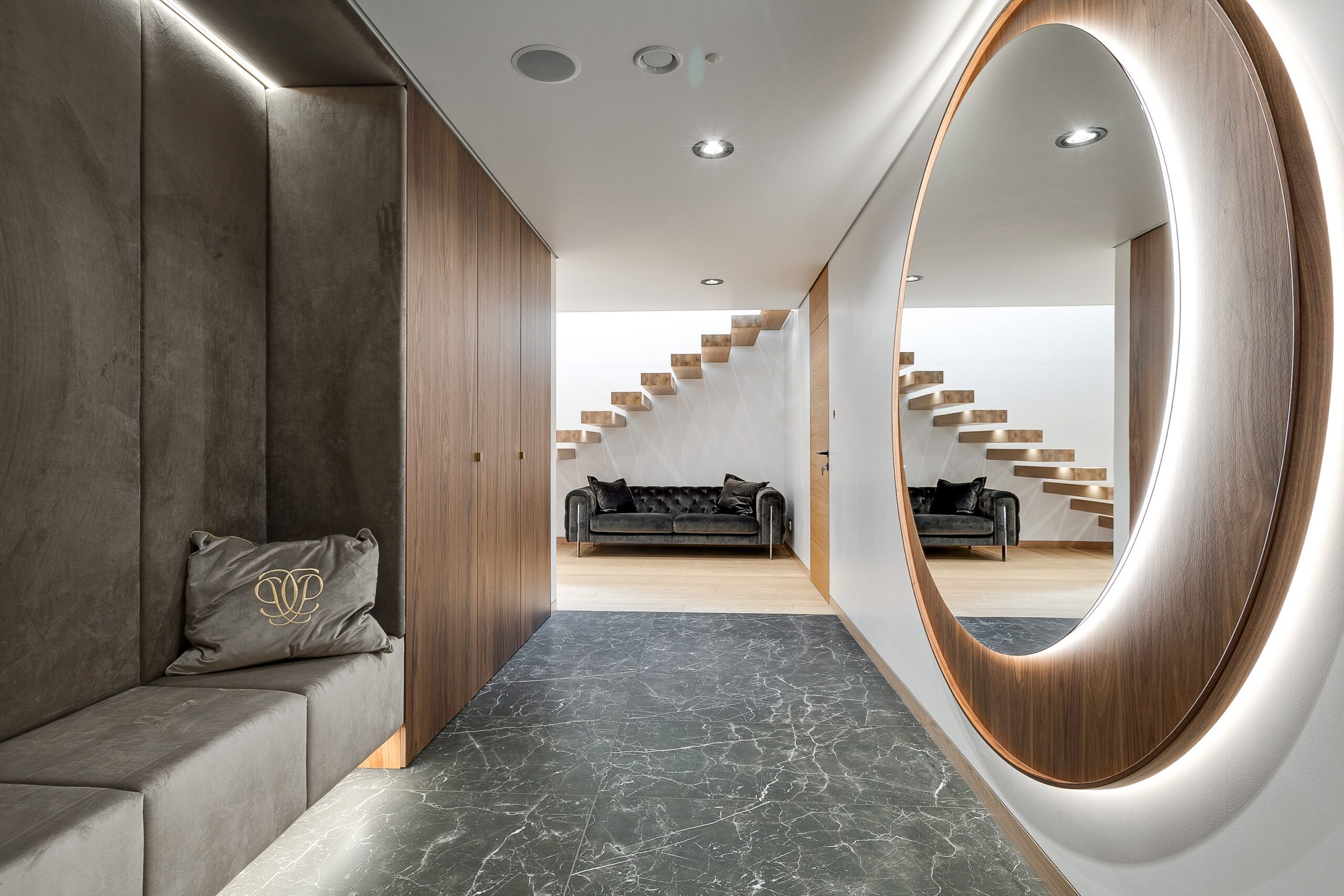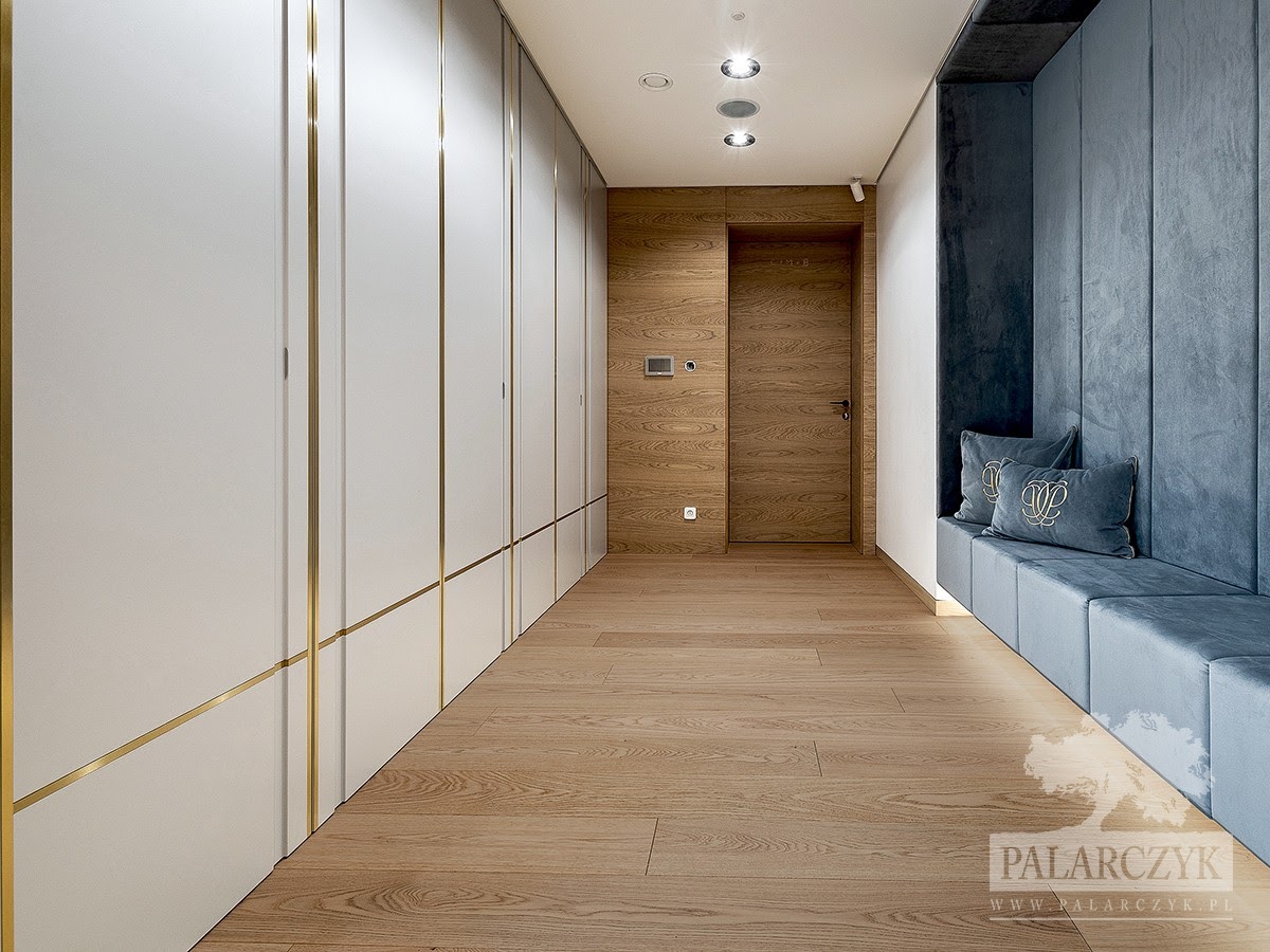 Drzwi w fornirze dębowym z elementem boazerii, elegancka szafa w zabudowie z wyrafinowanymi wstawkami z mosiądzu szczotkowanego oraz komfortowe tapicerowane siedzisko z podświetleniem LED – te trzy elementy stanowią niezwykłe i funkcjonalne dopełnienie każdego wiatrołapu. Dzięki nim każde wiatrołap nabiera charakteru i wyjątkowej atmosfery.