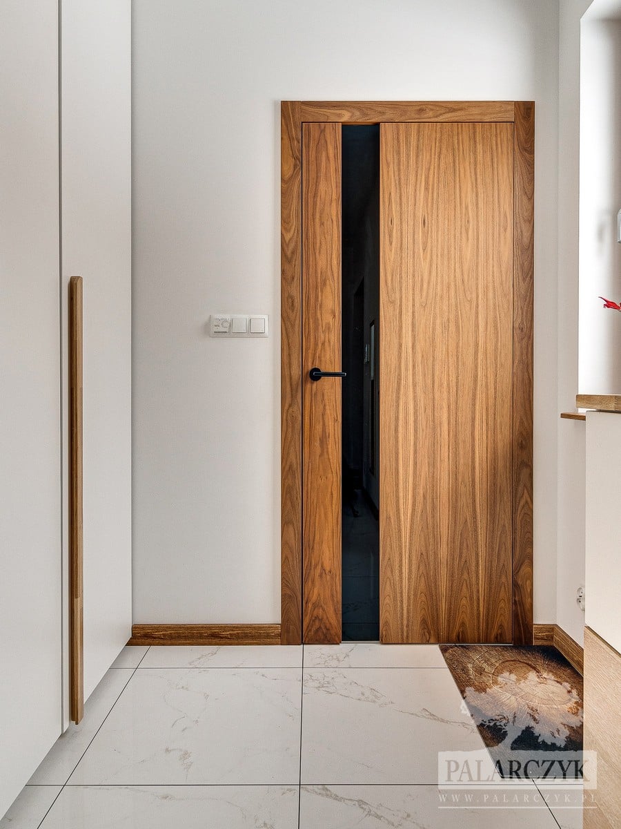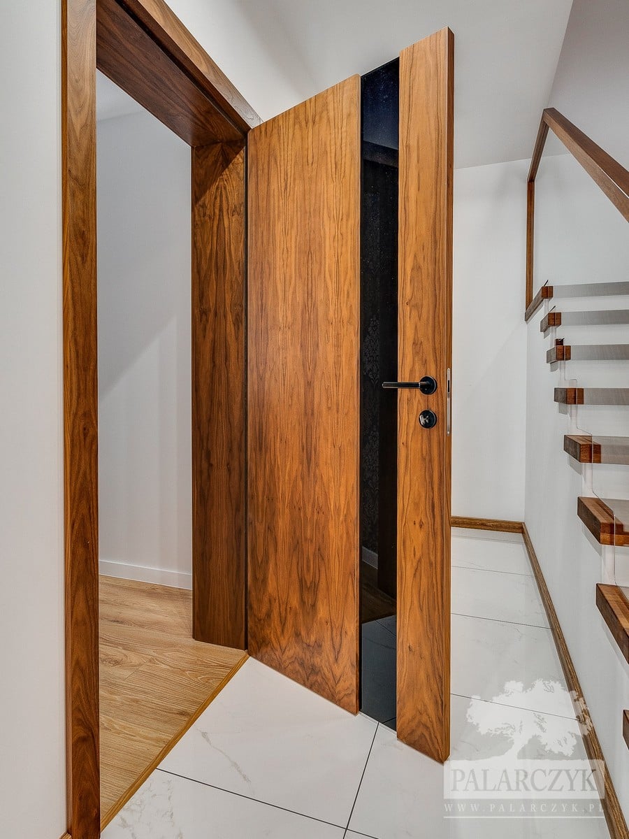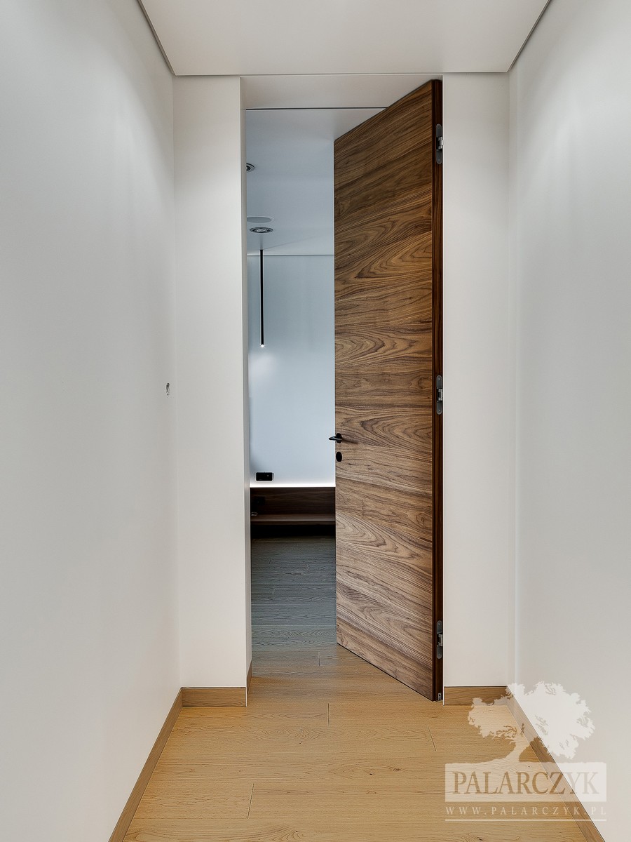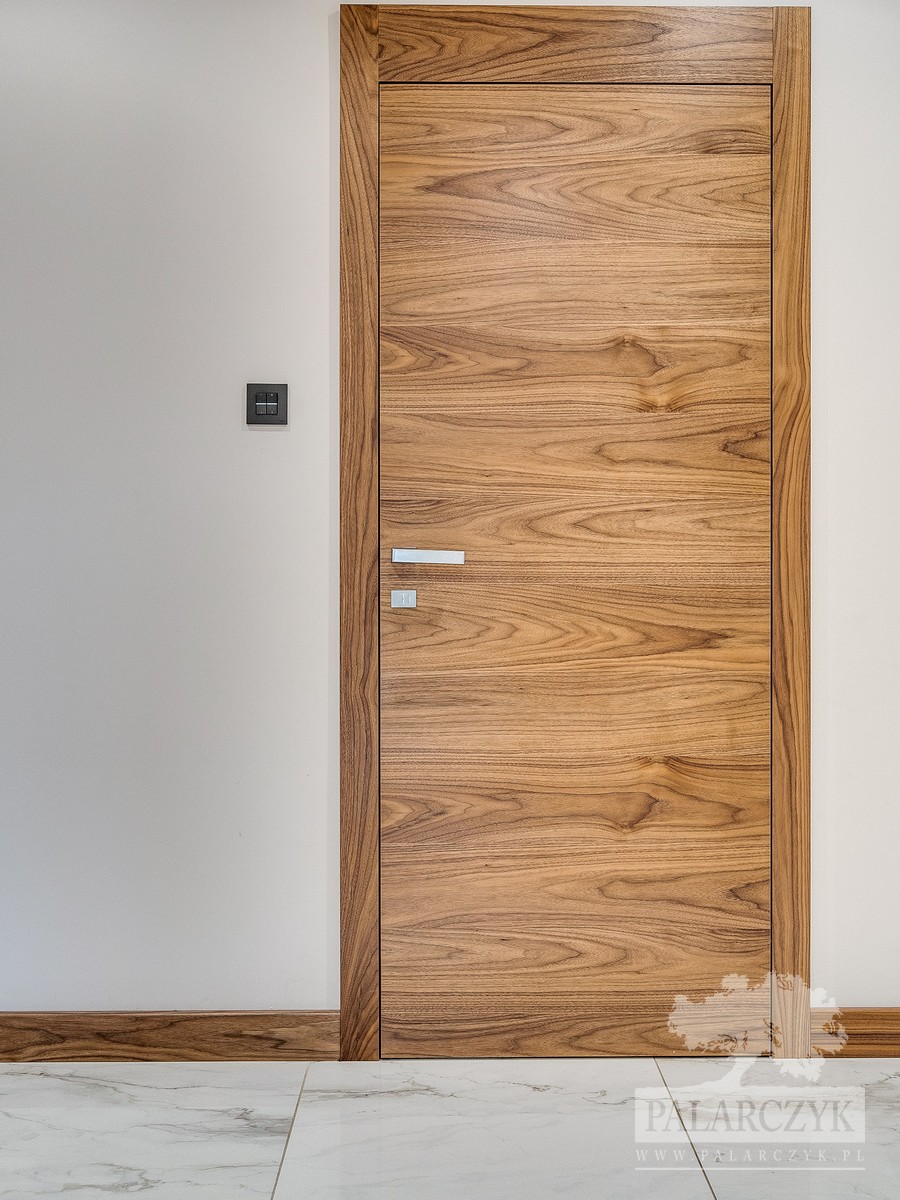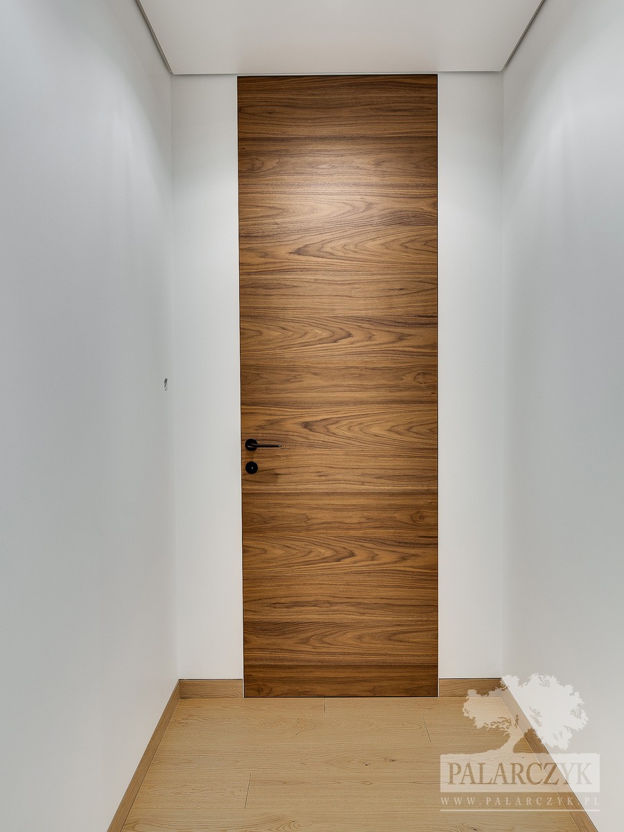 Drzwi wewnętrzne zamontowane na ukrytej ościeżnicy, wykończone w ciepłym odcieniu orzecha amerykańskiego. Drzwi charakteryzują się gładką, jednolitą powierzchnią bez widocznych zawiasów, co sprawia, że idealnie komponują się z nowoczesnymi i minimalistycznymi wnętrzami. Orzech amerykański nadaje wnętrzu wyrafinowany i luksusowy charakter, jednocześnie tworząc przytulną atmosferę. Ten model drzwi jest idealnym rozwiązaniem dla osób ceniących sobie zarówno funkcjonalność, jak i estetyczny design.