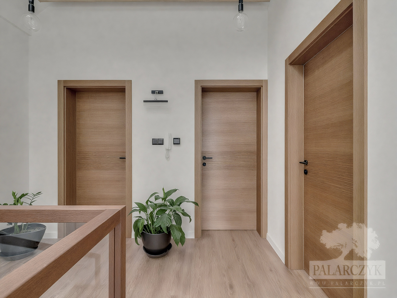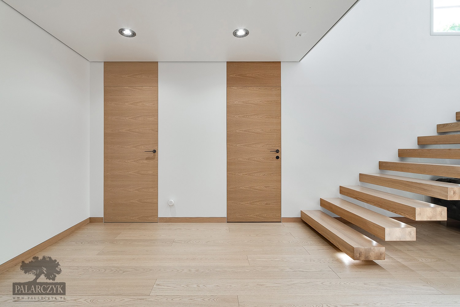 Poniższe drzwi wykonane są w fornirze dębowym, co nadaje im ciepłego i naturalnego wyglądu. Unikatowe frezowanie w strefie klamki, które dodaje subtelnego detalu, jest wyróżniającym elementem designu, podkreślającym wysoką jakość i unikalność wykonania. Prostota klamek w czarnym kolorze kontrastuje z naturalnym odcieniem drewna dębowego, dodając nowoczesnego akcentu do wnętrza. Całość kompozycji znajduje się w jasnej, dobrze oświetlonej przestrzeni, co jeszcze bardziej podkreśla estetykę drewnianych elementów. Drzwi te harmonijnie współgrają z drewnianą podłogą i minimalistycznym wystrojem, tworząc spójny i przytulny obraz współczesnego wnętrza.