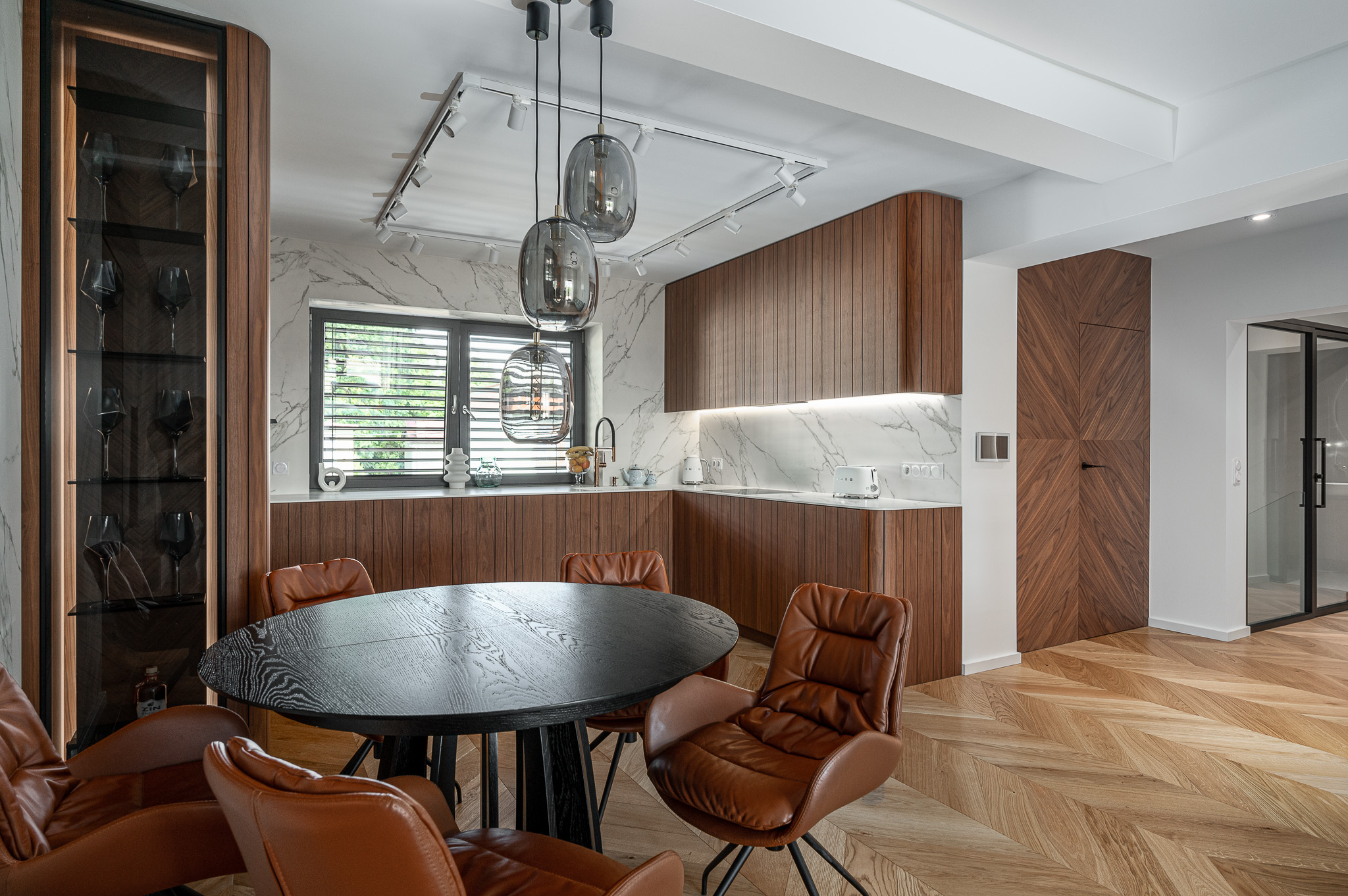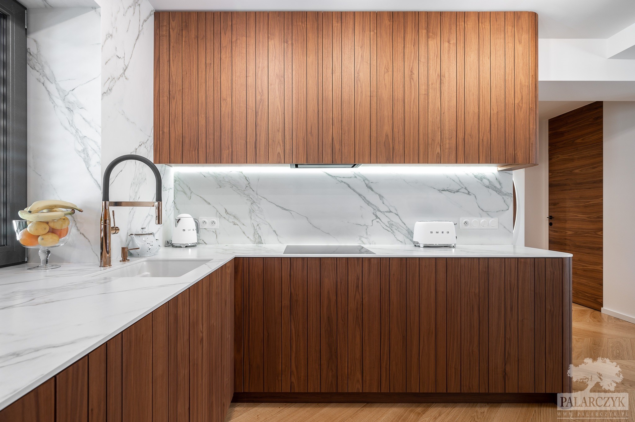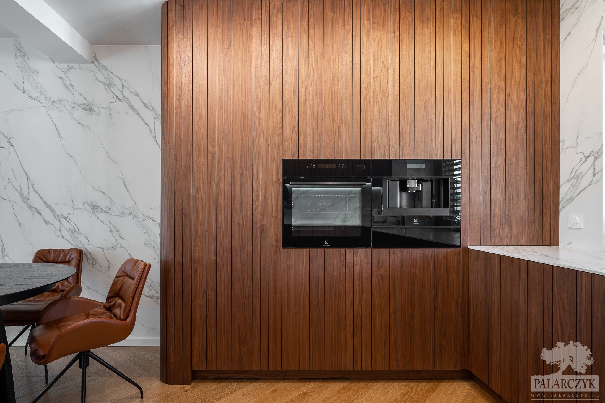 Realizacja kuchni w matowym orzechu amerykańskim z nieregularnymi nacięciami, które perfekcyjnie ukrywają wszelkie szczeliny konstrukcyjne, tworząc jednolity wzór na płaszczyźnie frontów. Dodatkowo, zaokrąglone krawędzie oraz blaty ze spieku z dekorem marmuru Calacatta dodają niezwykłych wrażeń wizualnych, podkreślając elegancję i nowoczesność tego wnętrza.