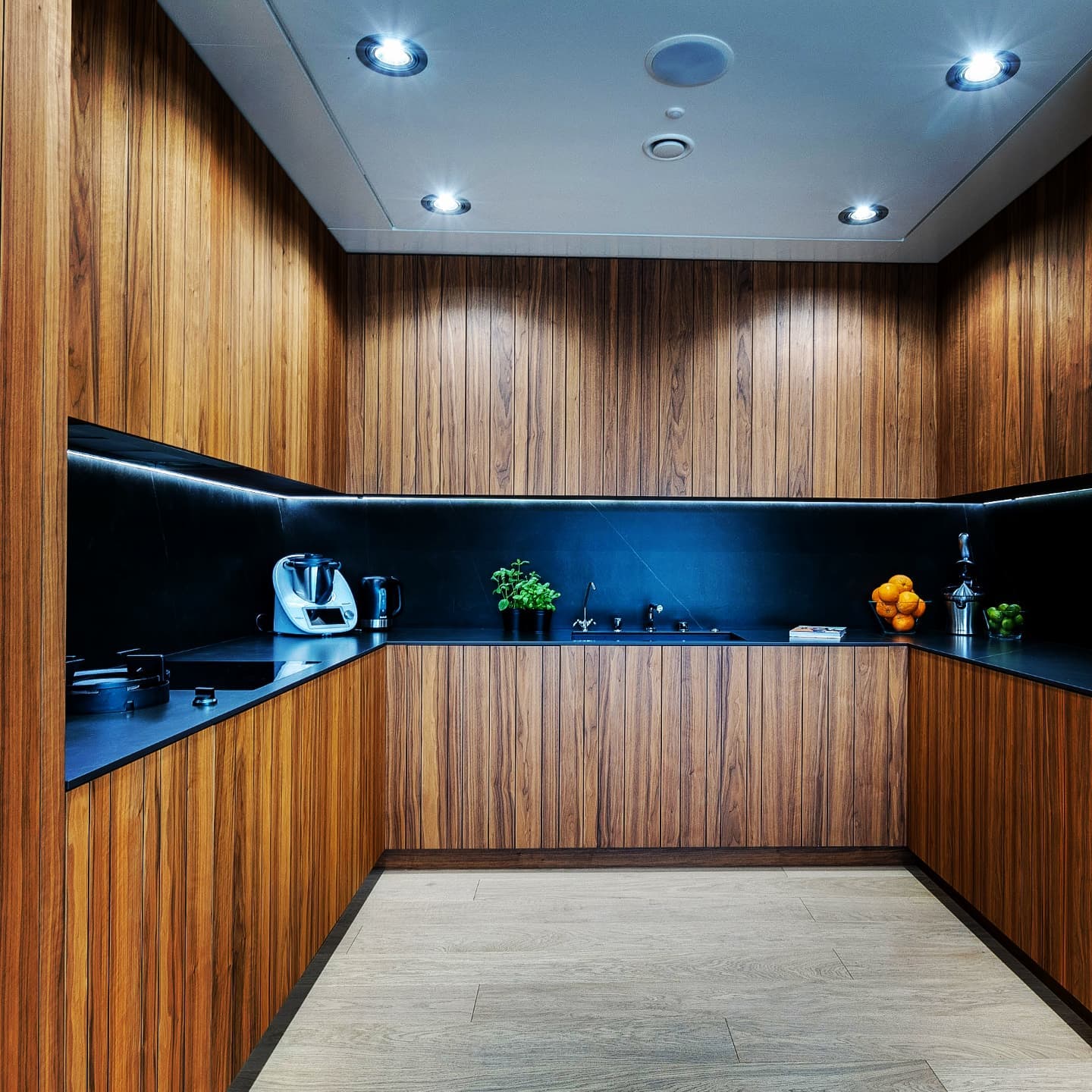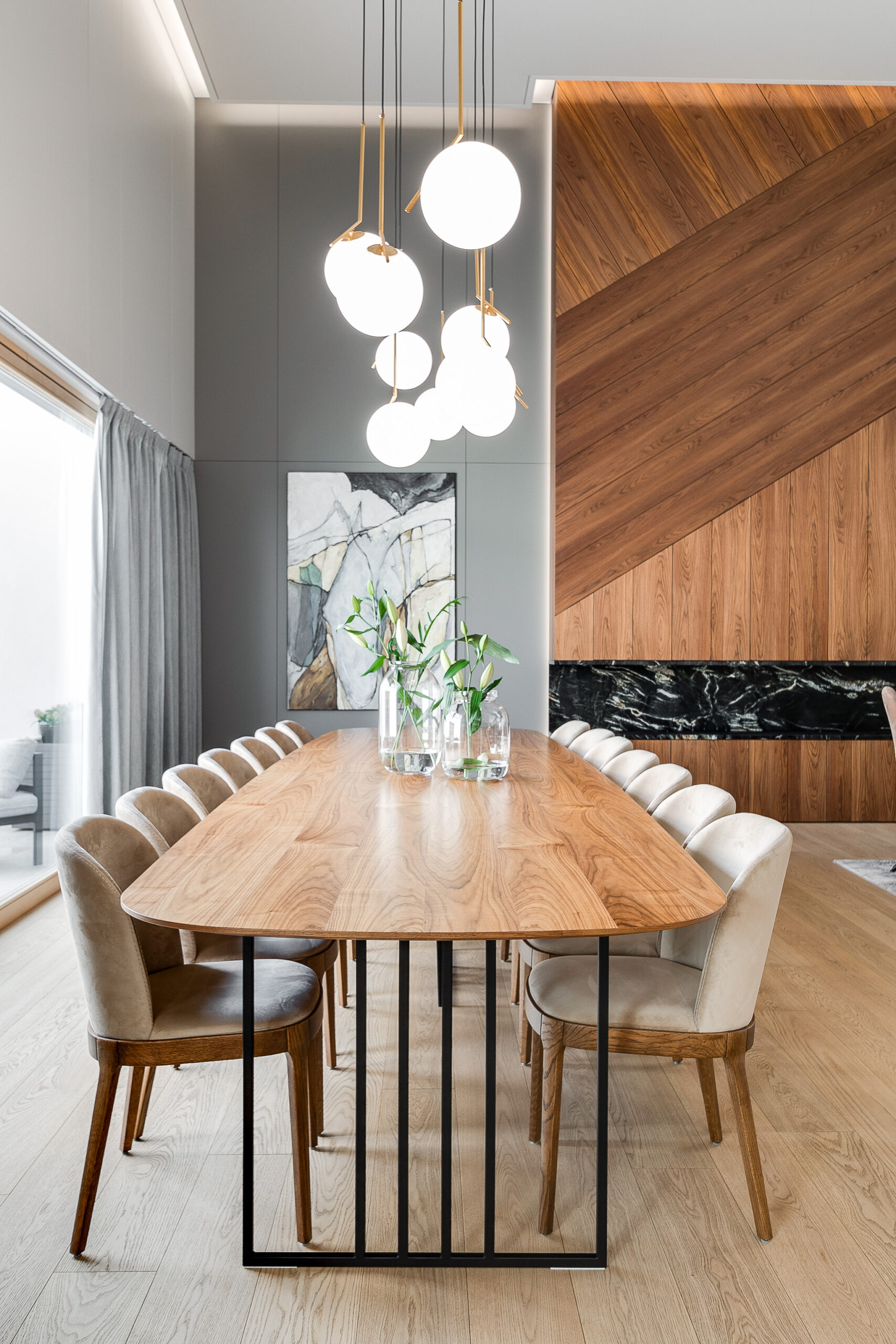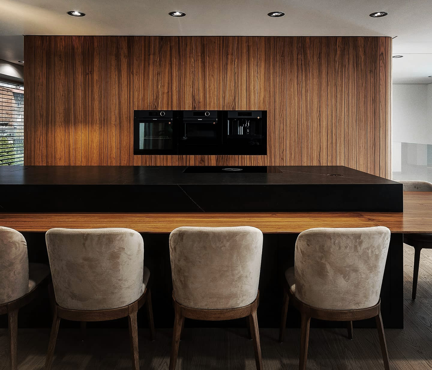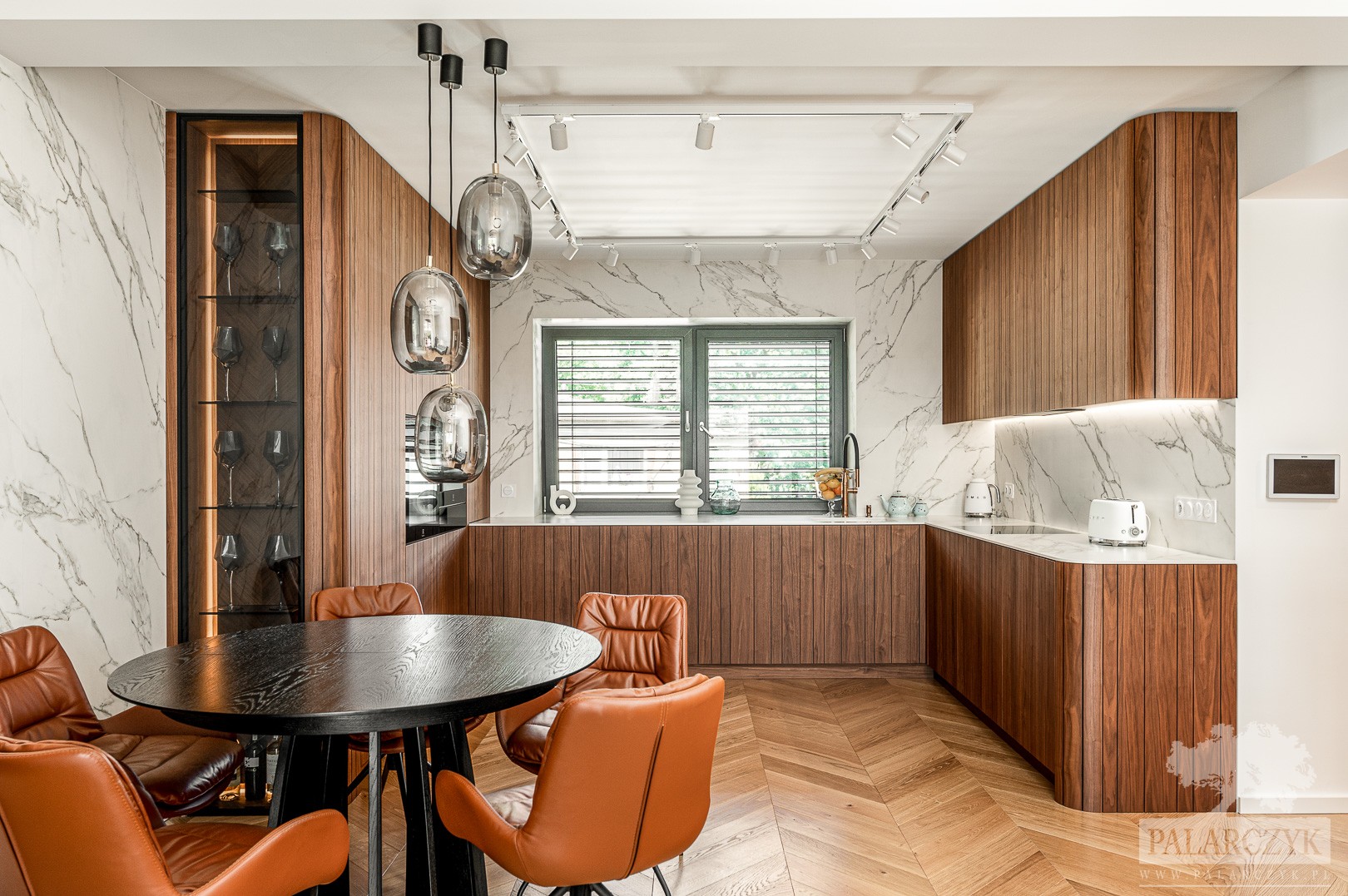 Realizacja kuchni w matowym orzechu amerykańskim z nieregularnymi nacięciami, które perfekcyjnie ukrywają wszelkie szczeliny konstrukcyjne, tworząc jednolity wzór na płaszczyźnie frontów. Dodatkowo, zaokrąglone krawędzie oraz blaty ze spieku z dekorem marmuru Calacatta dodają niezwykłych wrażeń wizualnych, podkreślając elegancję i nowoczesność tego wnętrza.