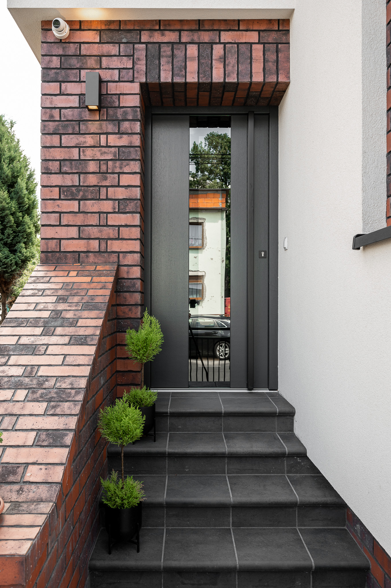 Drzwi zewnętrzne model DZ-2, wykonane na wymiar, zachwycają czarnym pochwytem, który dodaje im elegancji i nowoczesności. Szyba refleksyjna, płynnie licowana z płaszczyzną skrzydła, w połączeniu z drewnem dębowym lakierowanym na głęboki kolor antracyt, ukazuje wyraźną, naturalną strukturę drewna, tworząc efektowy kontrast i niezwykły urok.