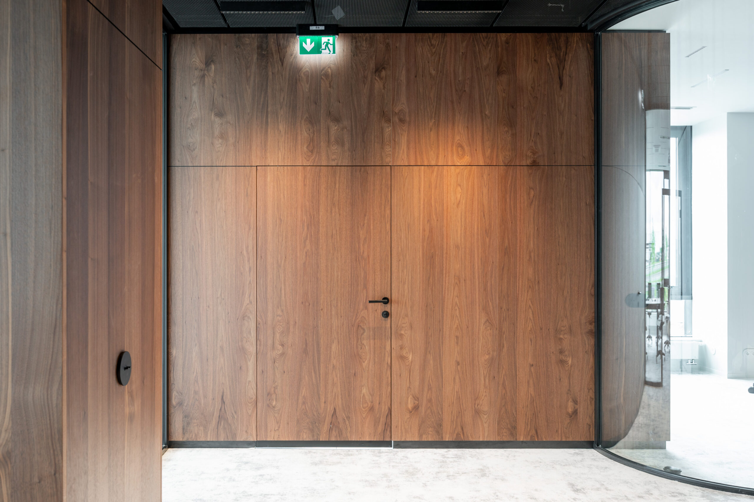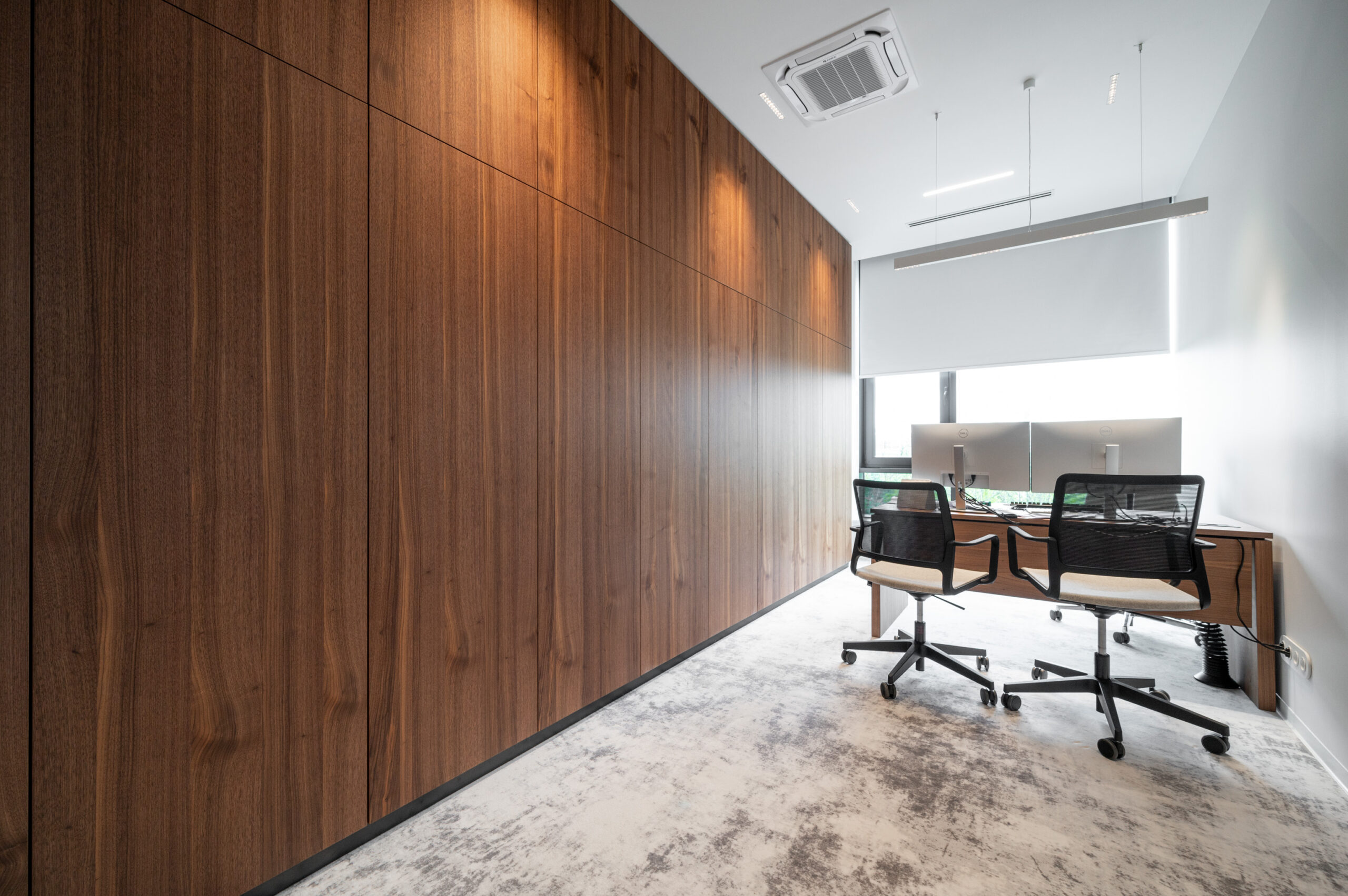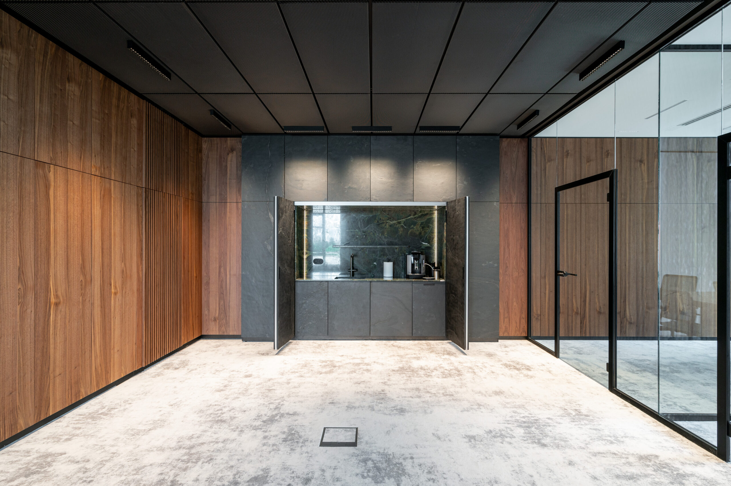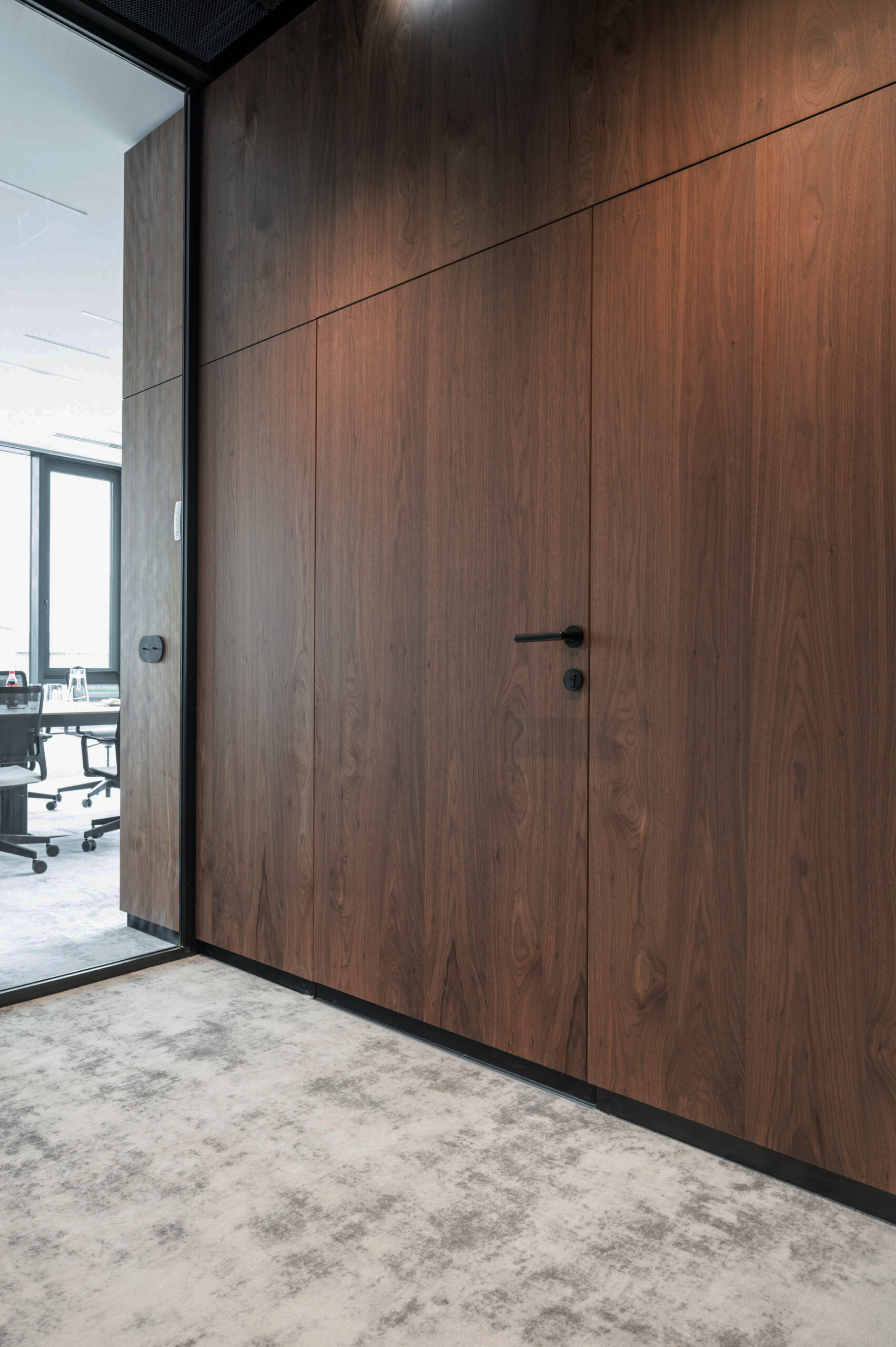 W ramach współpracy z KNAP Studio zrealizowaliśmy kompleksową zabudowę części biurowej firmy produkcyjnej Grembox. Wykonaliśmy zabudowy ścian wraz z drzwiami wewnętrznymi, kuchnię reprezentacyjną i roboczą, a także meble łazienkowe i biurowe.Do realizacji wykorzystaliśmy naturalny fornir z orzecha amerykańskiego, który nadaje wnętrzu elegancji i ciepła. Całość została wykończona matowym lakierem, podkreślającym naturalny charakter drewna i zapewniającym harmonijny, nowoczesny wygląd przestrzeni.