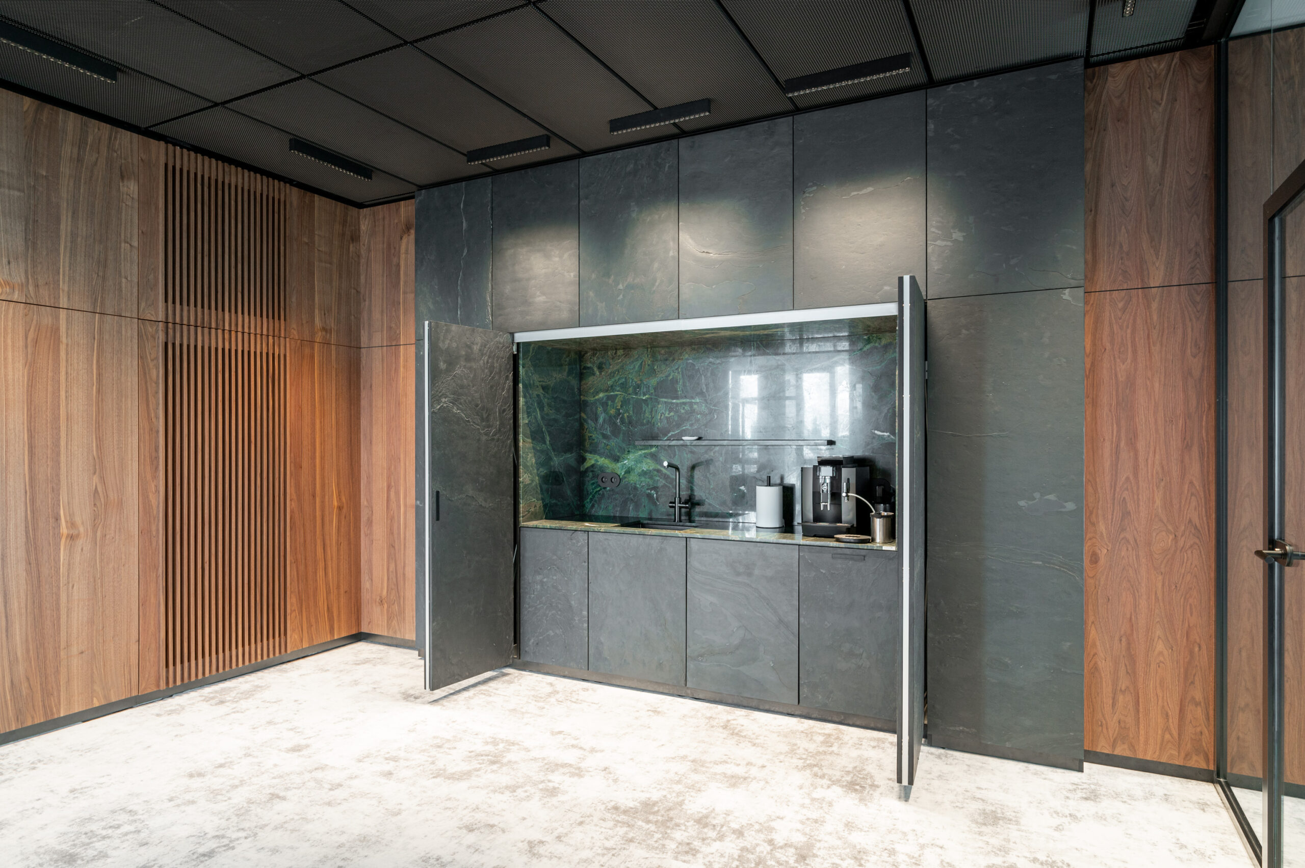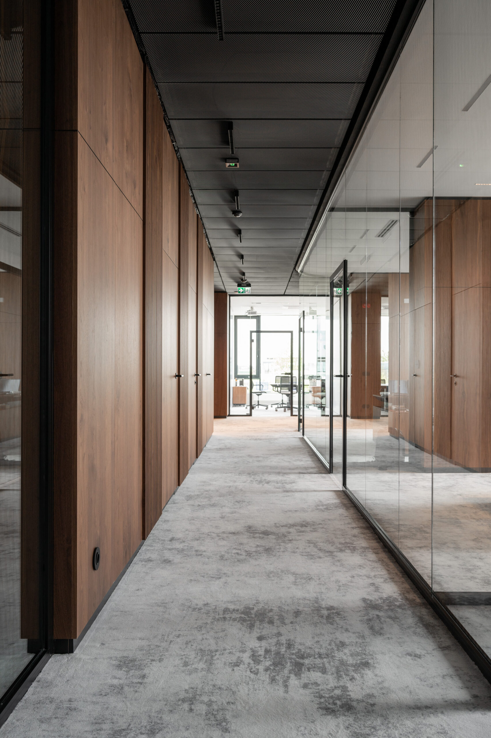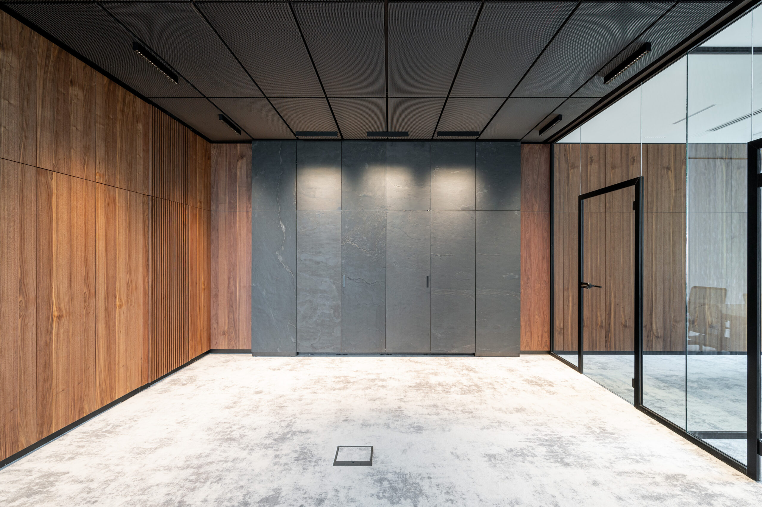 W ramach współpracy z KNAP Studio zrealizowaliśmy kompleksową zabudowę części biurowej firmy produkcyjnej Grembox. Wykonaliśmy zabudowy ścian wraz z drzwiami wewnętrznymi, kuchnię reprezentacyjną i roboczą, a także meble łazienkowe i biurowe.Do realizacji wykorzystaliśmy naturalny fornir z orzecha amerykańskiego, który nadaje wnętrzu elegancji i ciepła. Całość została wykończona matowym lakierem, podkreślającym naturalny charakter drewna i zapewniającym harmonijny, nowoczesny wygląd przestrzeni.