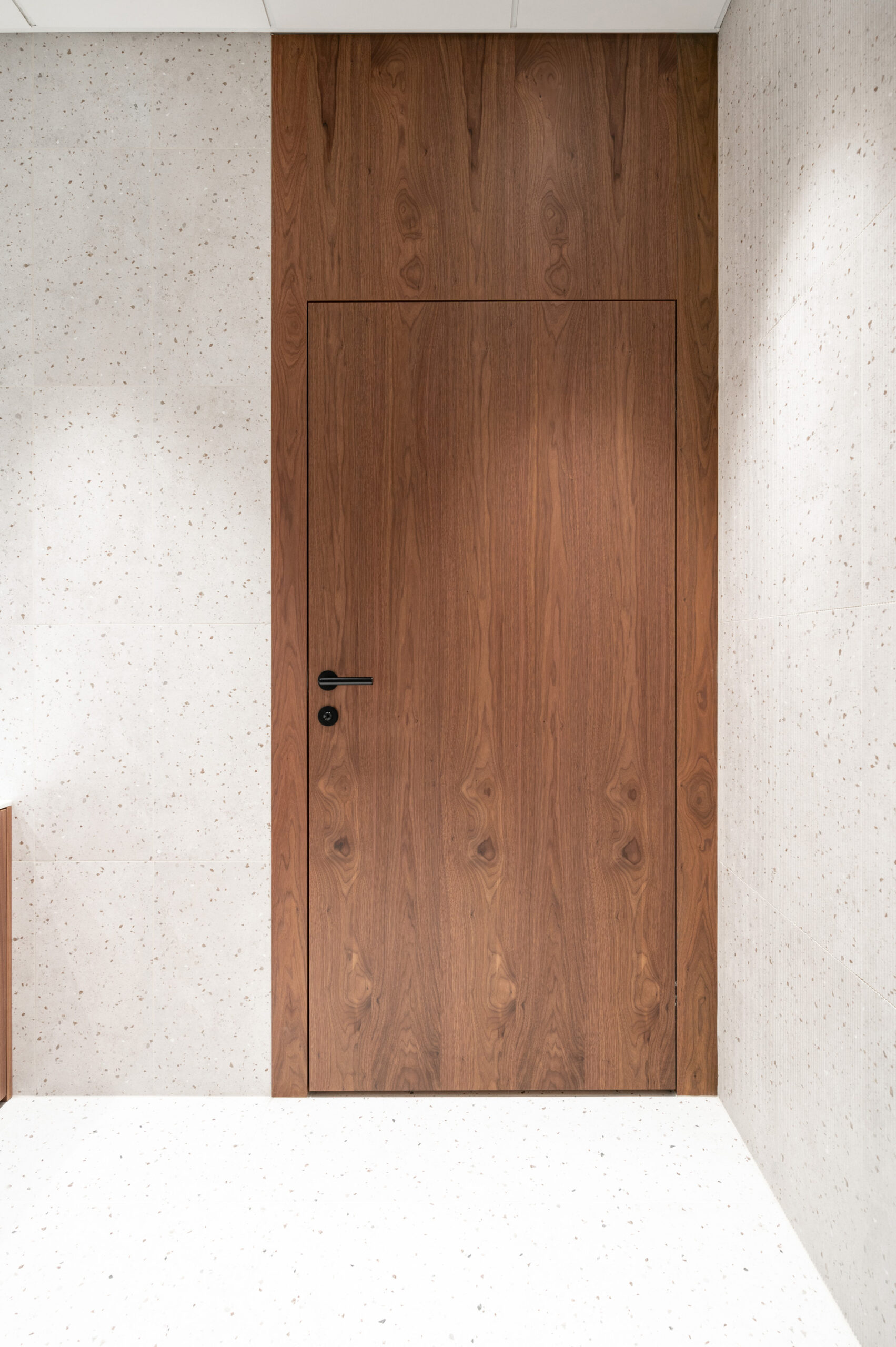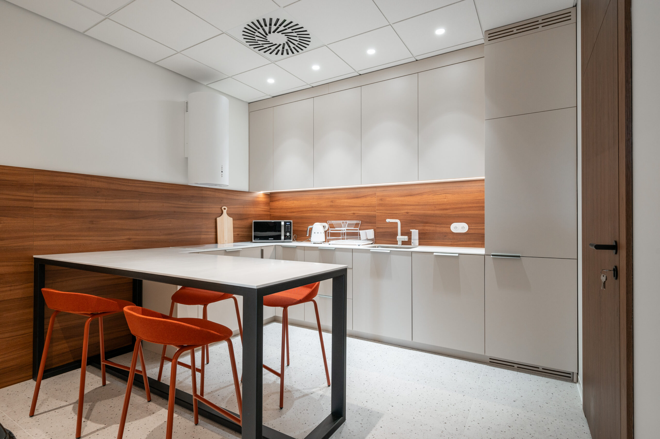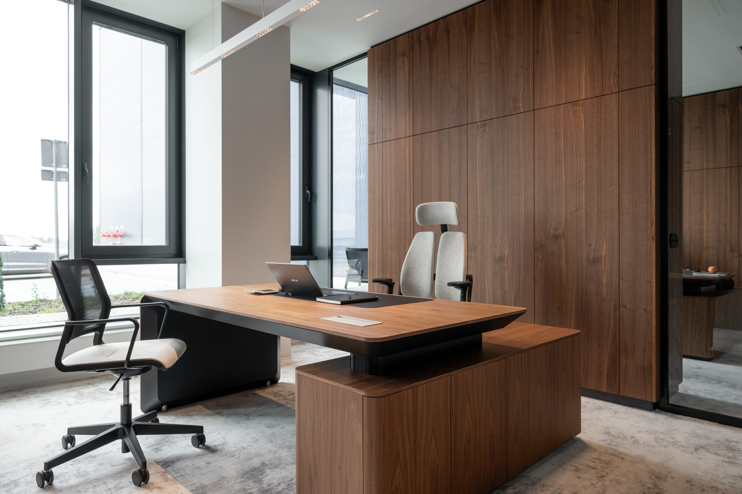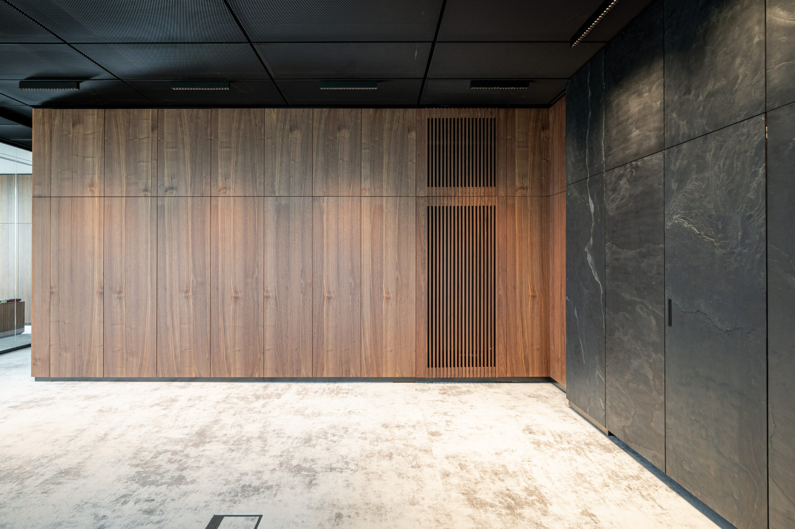 W ramach współpracy z KNAP Studio zrealizowaliśmy kompleksową zabudowę części biurowej firmy produkcyjnej Grembox. Wykonaliśmy zabudowy ścian wraz z drzwiami wewnętrznymi, kuchnię reprezentacyjną i roboczą, a także meble łazienkowe i biurowe.Do realizacji wykorzystaliśmy naturalny fornir z orzecha amerykańskiego, który nadaje wnętrzu elegancji i ciepła. Całość została wykończona matowym lakierem, podkreślającym naturalny charakter drewna i zapewniającym harmonijny, nowoczesny wygląd przestrzeni.