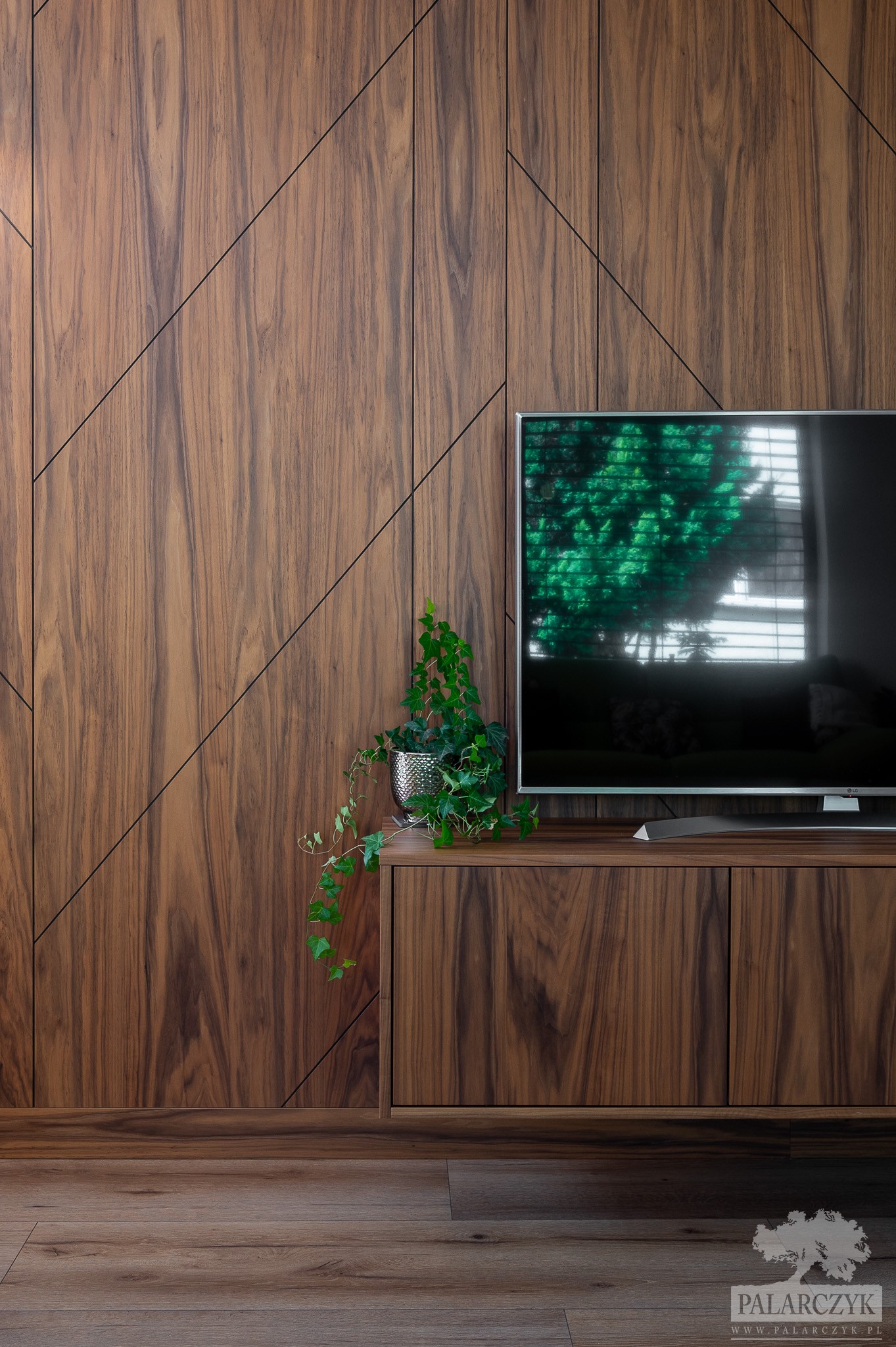 Poniższa realizacja przedstawia boazerię na której wykonaliśmy frezowania aby urozmaicić nieco jej formę. Dodatkowo szafka RTV wykonana w tym samym materiale dopełnia jakby całość.