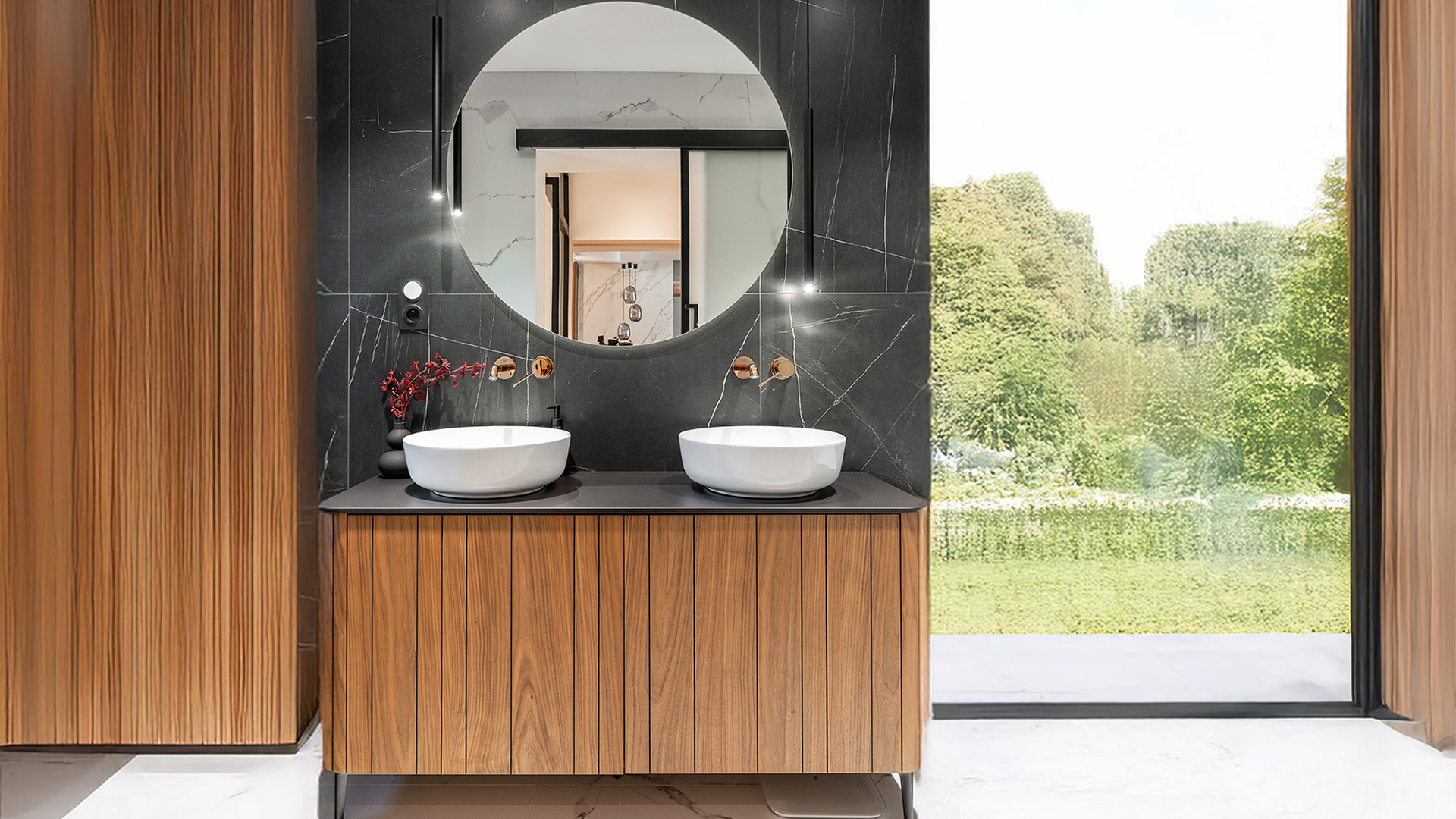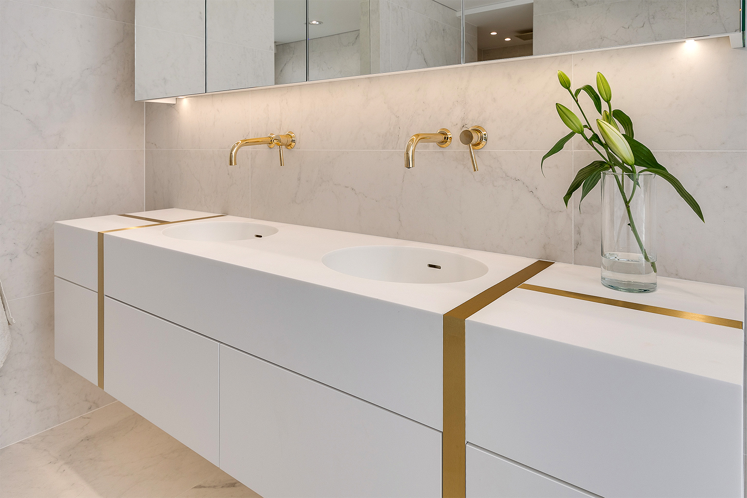 Na dołączonym zdjęciu widać mistrzowskie połączenie funkcjonalności i wyrafinowanego designu w postaci blatu łazienkowego, który płynnie łączy się z lakierowaną szafą. Blat wykonany jest z litego orzecha amerykańskiego, którego ciepła barwa dodaje wnętrzu elegancji. Specjalne wycięcie w blacie, przeznaczone na galwanizowany złotem uchwyt, stanowi nie tylko praktyczny detal, ale również eleganckie dopełnienie całej aranżacji. Złote akcenty, harmonizujące z uchwytem, tworzą spójny i luksusowy obraz łazienki, odzwierciedlając dbałość o każdy, nawet najmniejszy element wyposażenia.