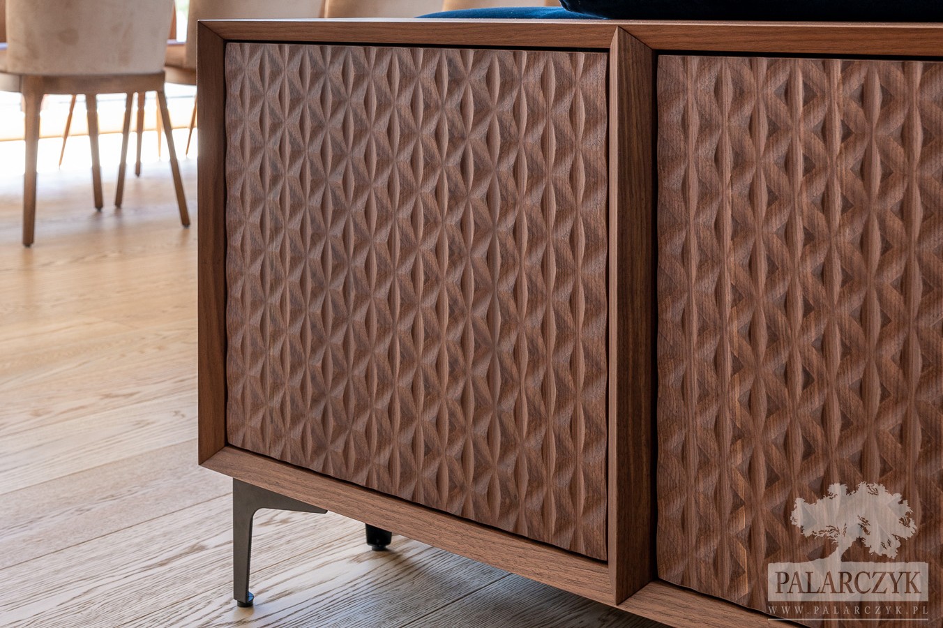 Komoda w salonie, umieszczona za sofą, charakteryzuje się charakterystycznym frezowaniem wykonanym z litego orzecha amerykańskiego. Wszystkie krawędzie mebla są wykonane pod kątem 45 stopni, co nadaje mu nowoczesny wygląd i elegancję. Jesteśmy gotowi dostosować mebel do indywidualnych wymiarów klienta. Zapraszamy do współpracy.