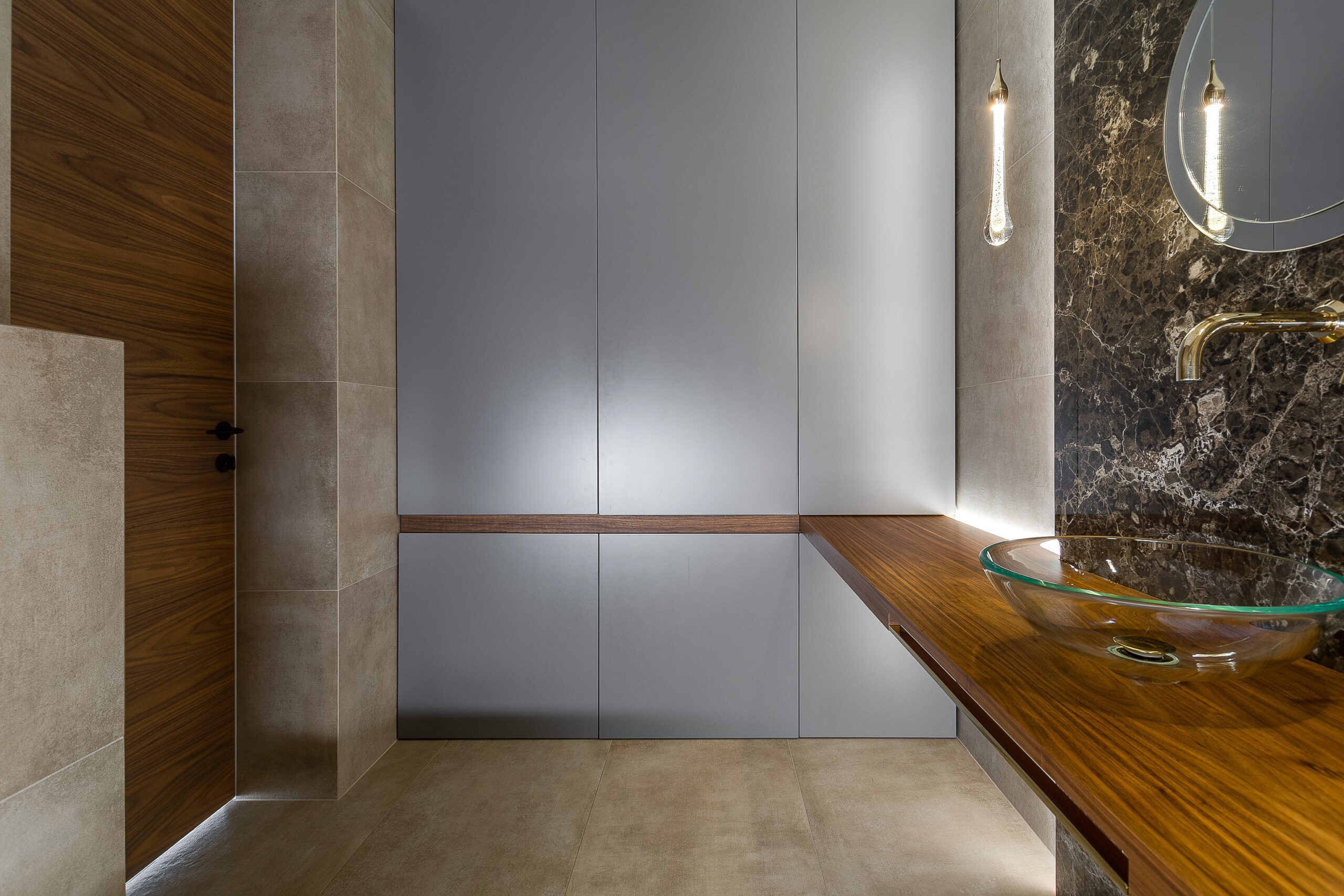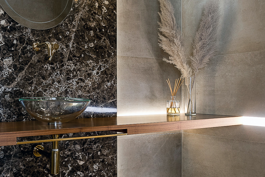 Realizacja zabudowy meblowej połączonej z tapicerowanym siedziskiem oraz lustrem z podświetleniem LED z efektem linii światła, wyprodukowana przez naszą firmę. Wszystkie widoczne elementy zostały wykończone fornirem z orzecha amerykańskiego, nadając wnętrzu elegancji i wyjątkowego charakteru.