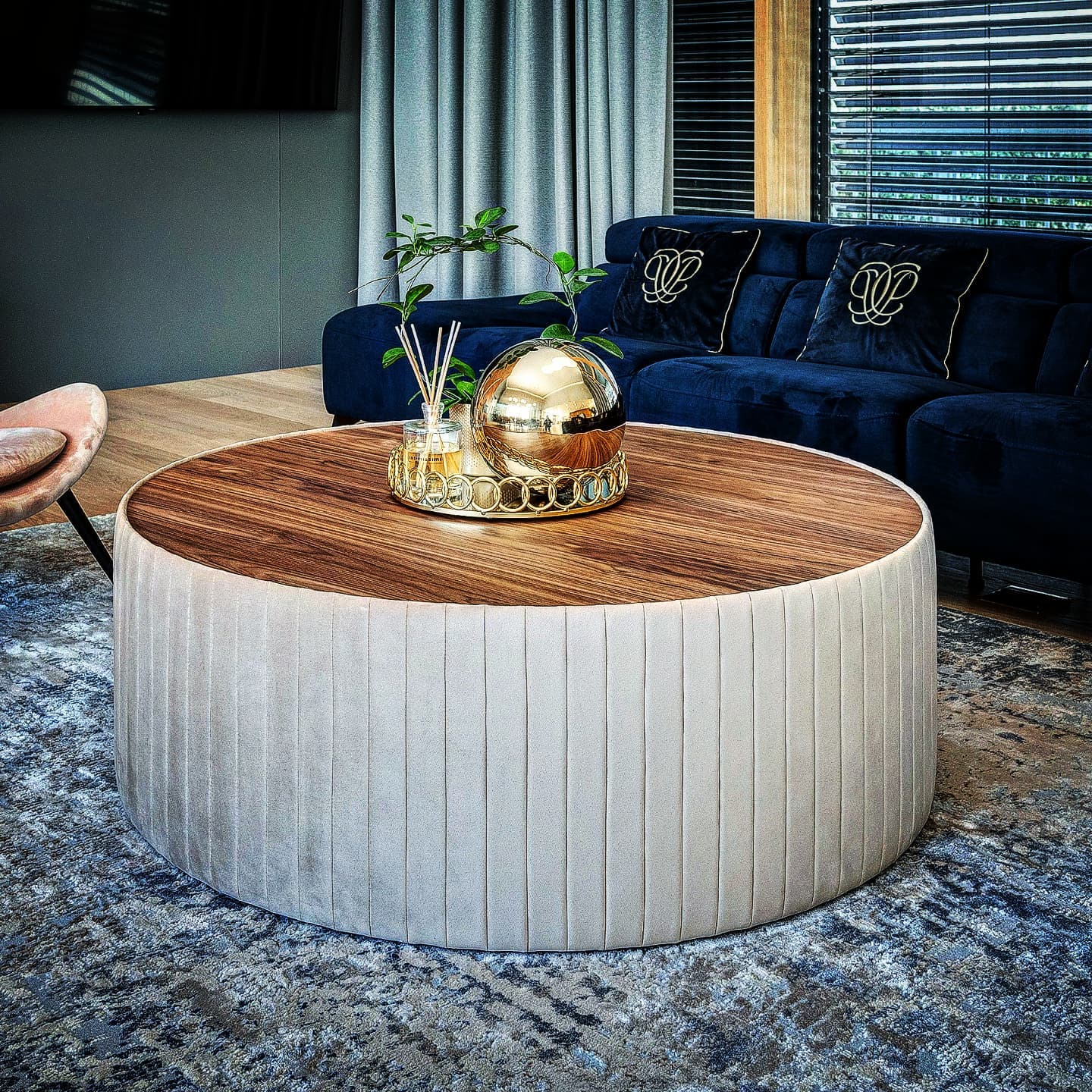 Boki stolika zostały obłożone tkaniną typu velvet z równomiernymi pionowymi przeszyciami, dodając mu elegancji i wyjątkowego wyglądu. Blat stolika wykonany został z forniru orzecha amerykańskiego, co nadaje mu wyjątkowej jakości i estetyki.Przy zamówieniu tego stolika zapewniamy dowolność wykończenia oraz rozmiarów, aby idealnie dopasować go do indywidualnych preferencji i potrzeb klienta.